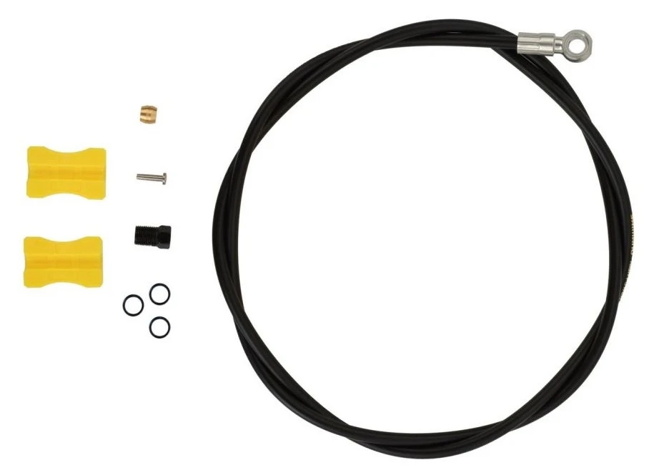 Replacement kit of hoses and ends for Shimano XTR M9000, XT M8000, XT M8100, XT M8120, SLX M7000, SLX M7100, SLX M7120 hydraulic brakes. The kit includes a hose with a pressed end, 1x olive, 1x mandrel, 3x seals.